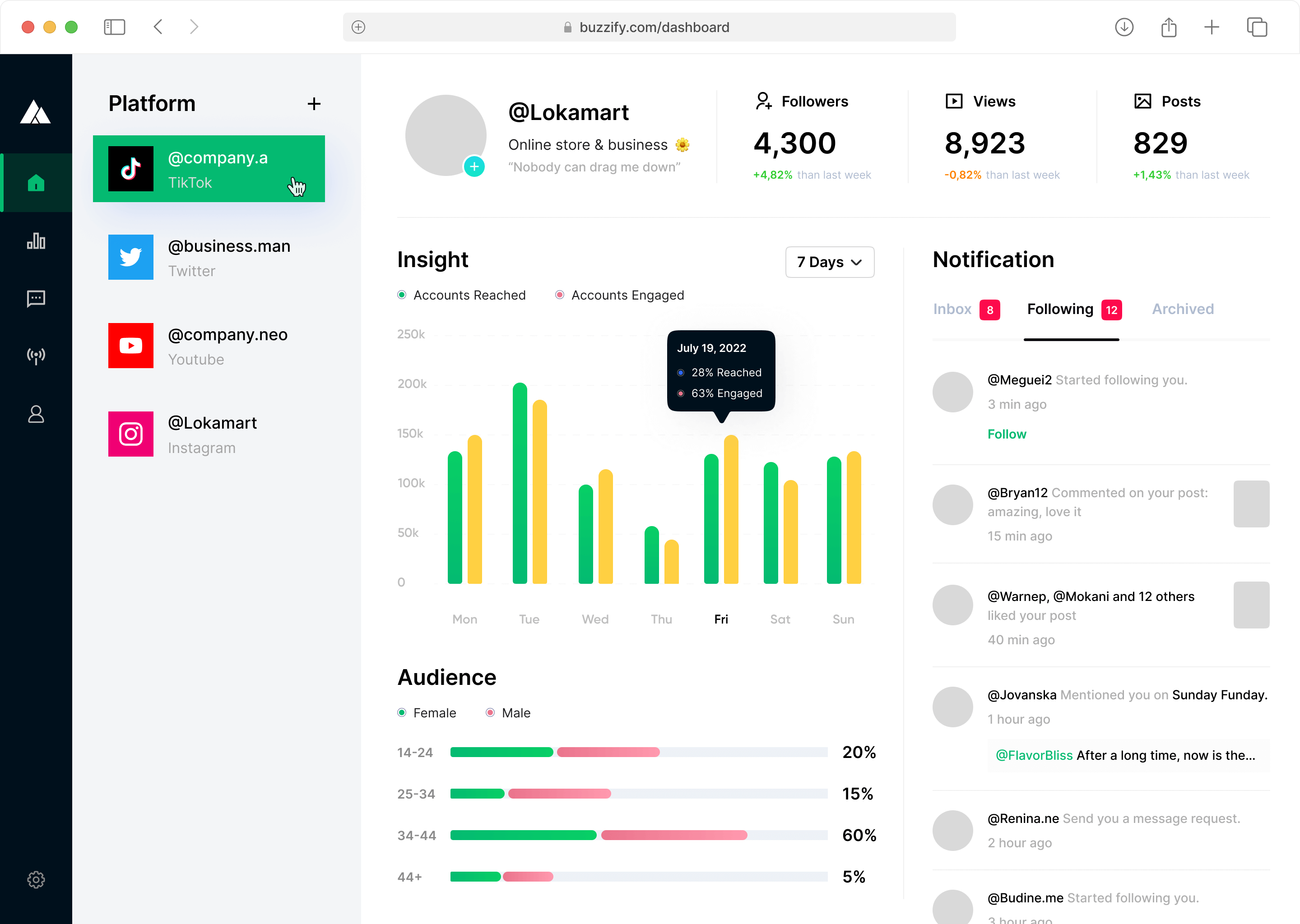 Manage all your social media platforms from one powerful dashboard. Schedule posts, monitor engagement, respond to messages, and track performance, all in one place.